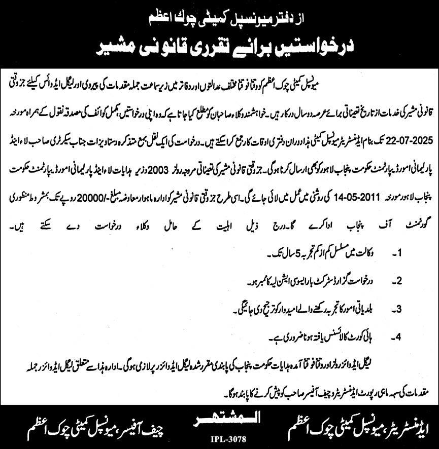 The Municipal Committee Layyah is seeking applications from qualified and dedicated candidates for the position of Legal Advisor. This government position offers a great opportunity for individuals with legal expertise to contribute to public service and play a vital role in municipal legal affairs.